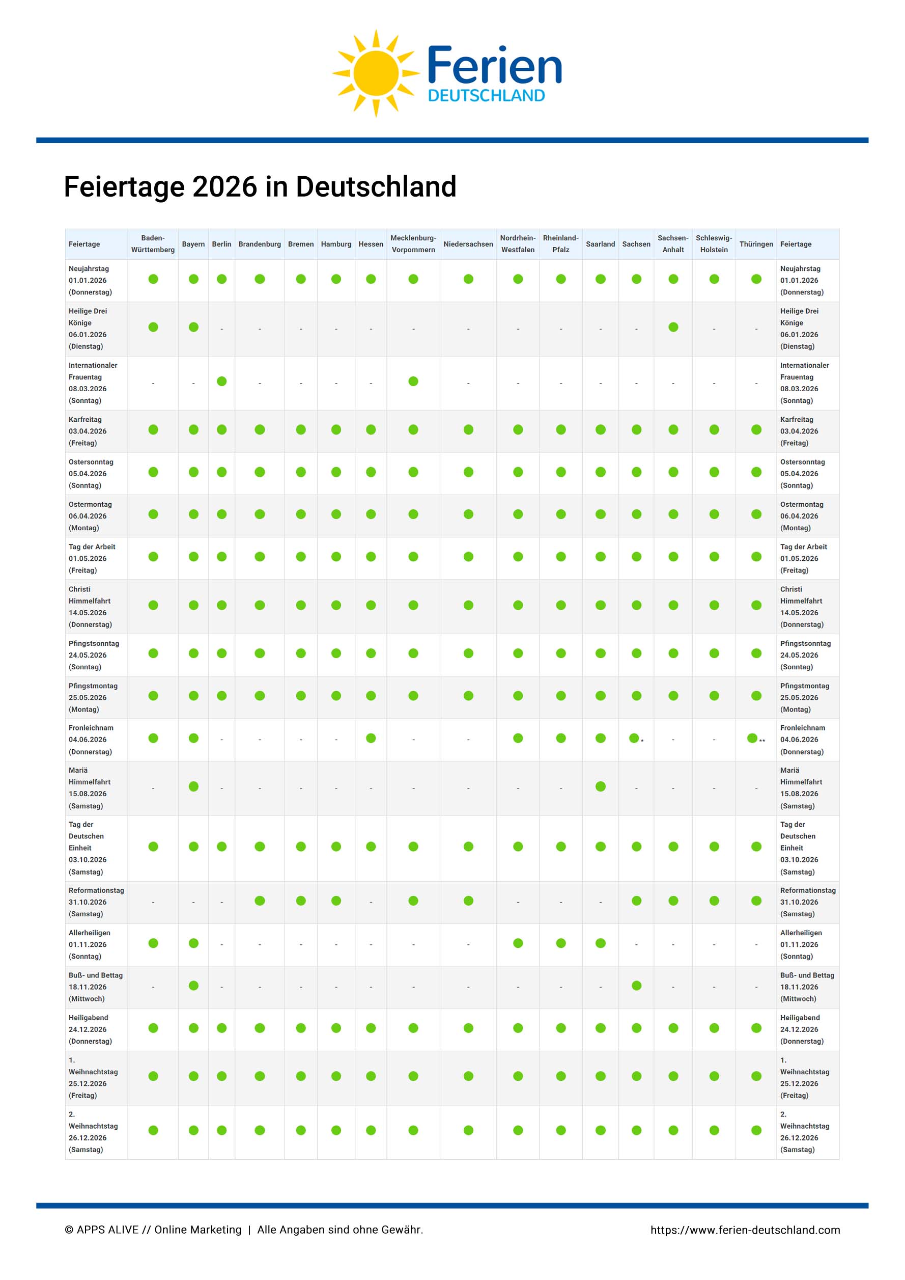 Alle Bundesländer im Überblick, Deutsche Feiertagen 2026