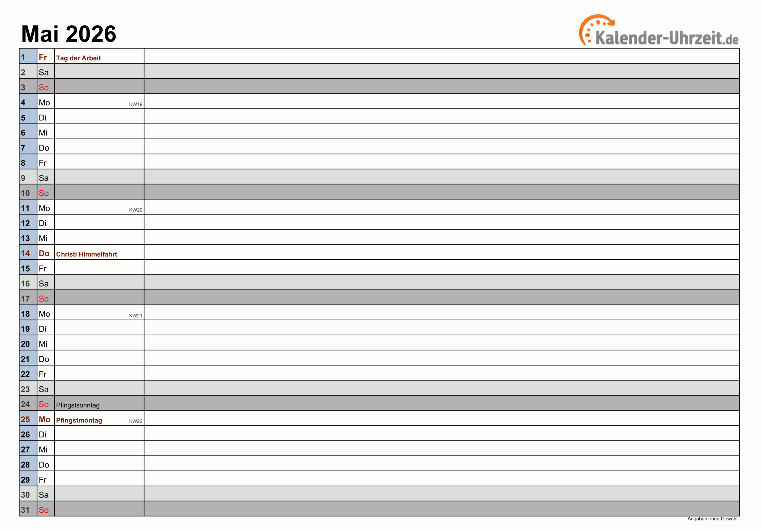 Hier siehst du eine visuelle Darstellung von Kreative Ideen zu Mai 2026 Kalender Mit Feiertagen www.kalender-uhrzeit.de