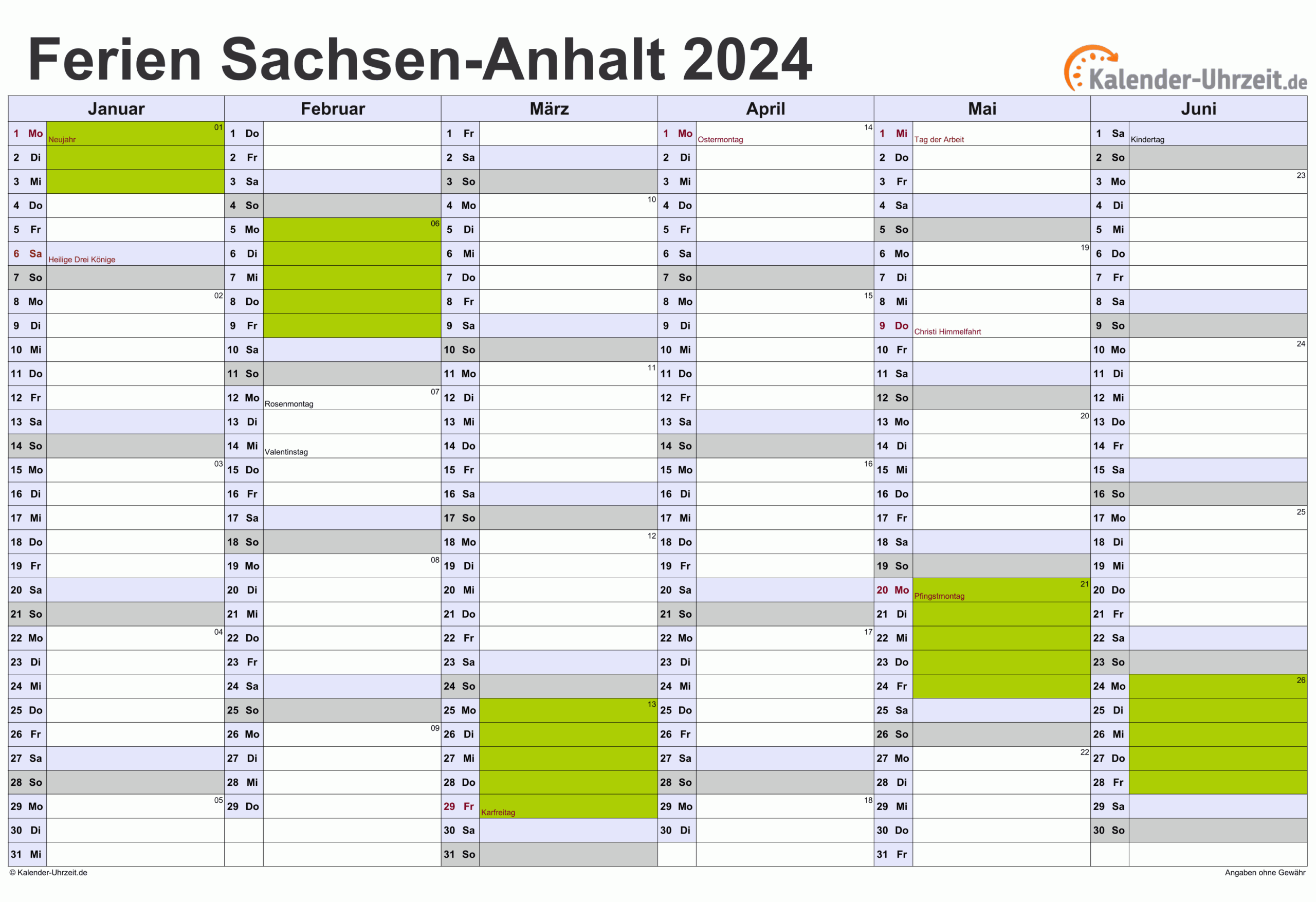 Kalender 2026 Sachsen-Anhalt kostenlos: Ferien-Übersicht, Feiertage …