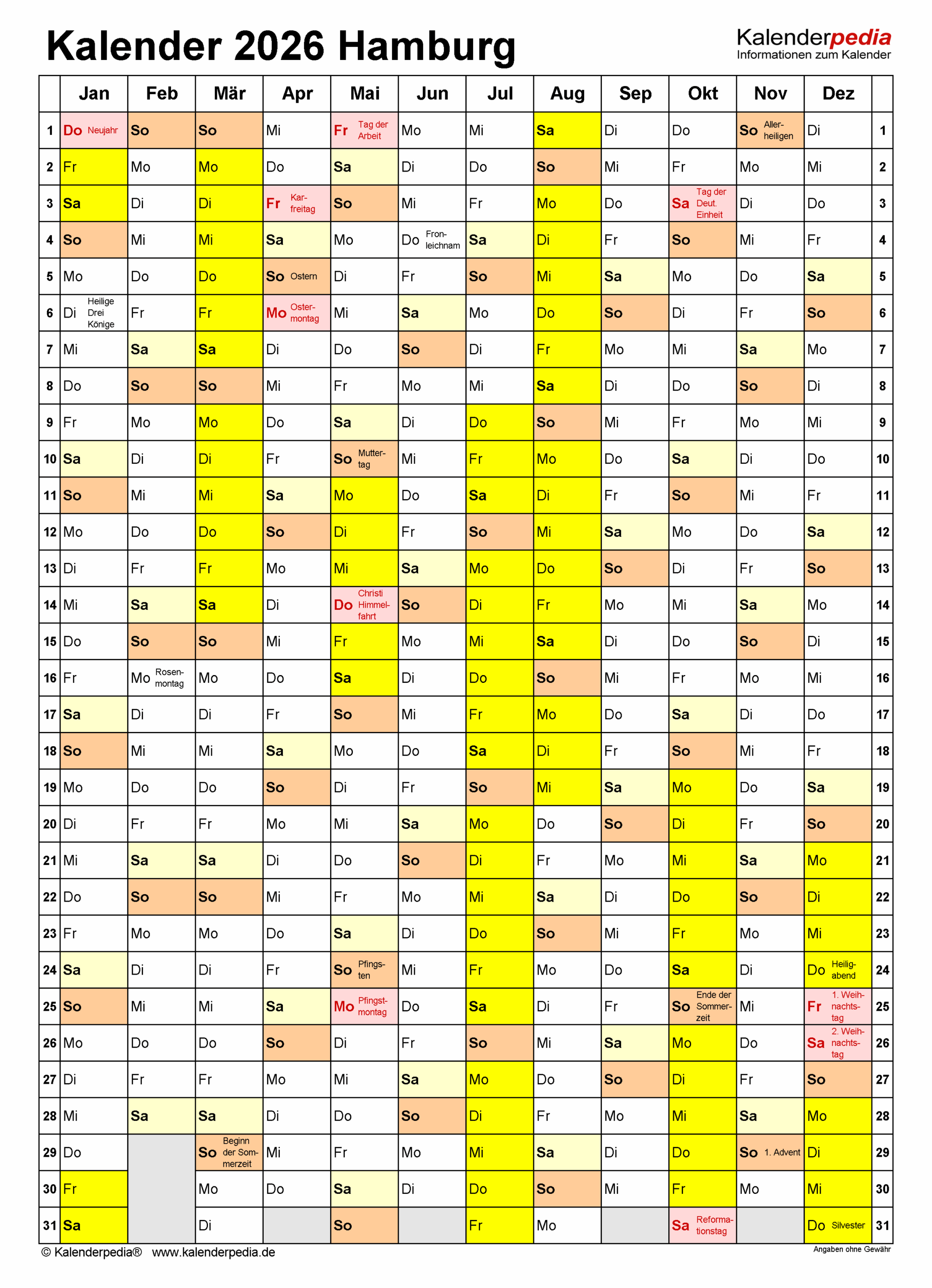 Kalender 2026 Hamburg: Ferien, Feiertage, Excel-Vorlagen – Bild & Inspiration