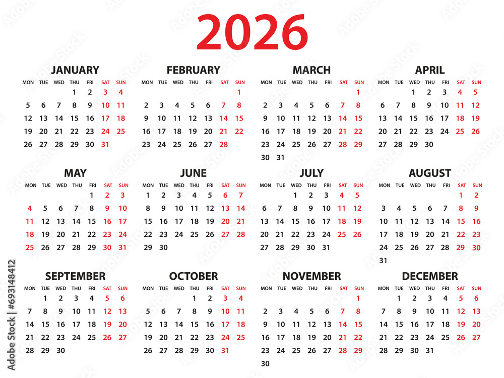 Calendar 2026 year vector illustration, Set of 12 calendar, week starts …