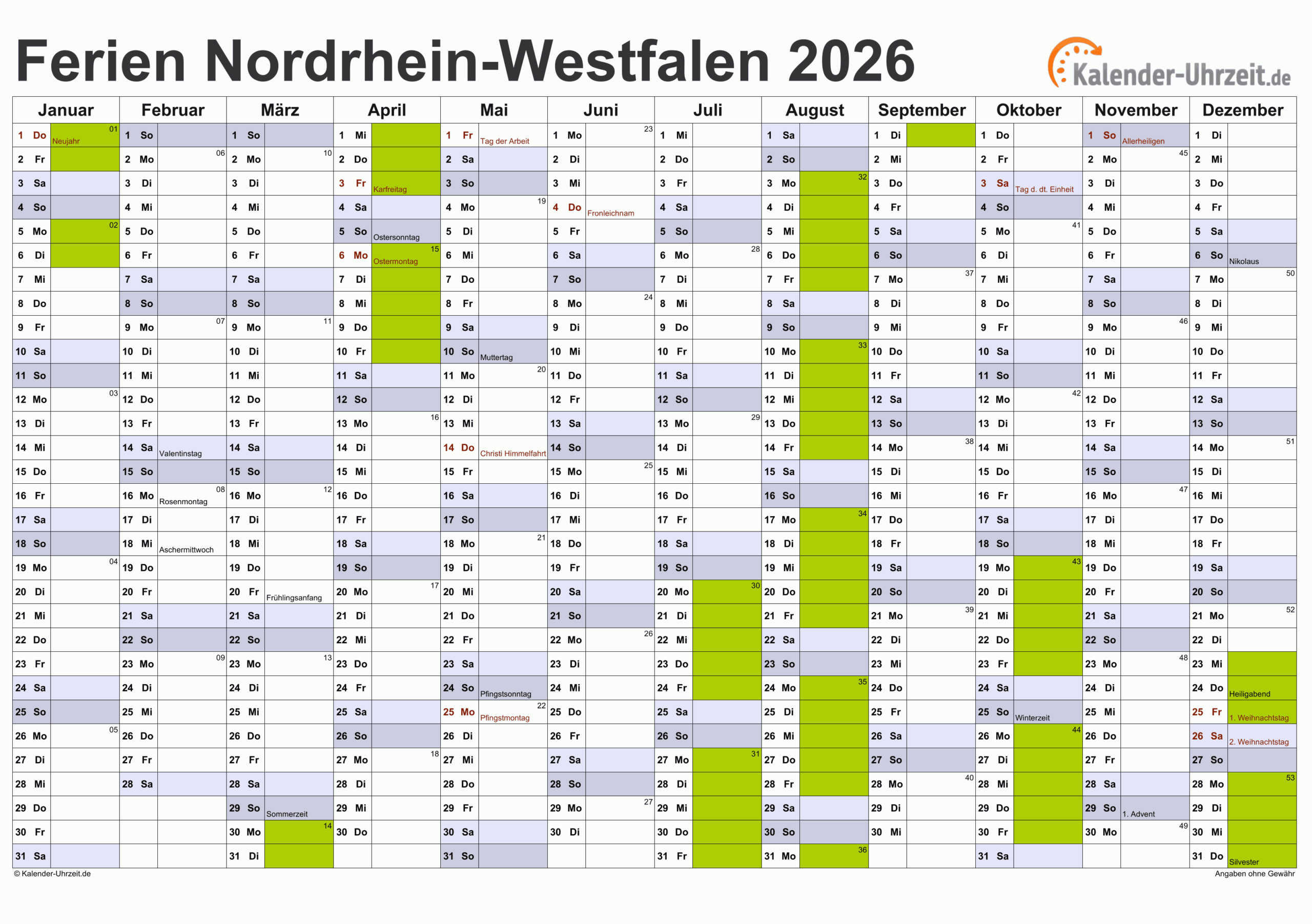 Kalender 2026 + Ferien Nordrhein-Westfalen, Feiertage