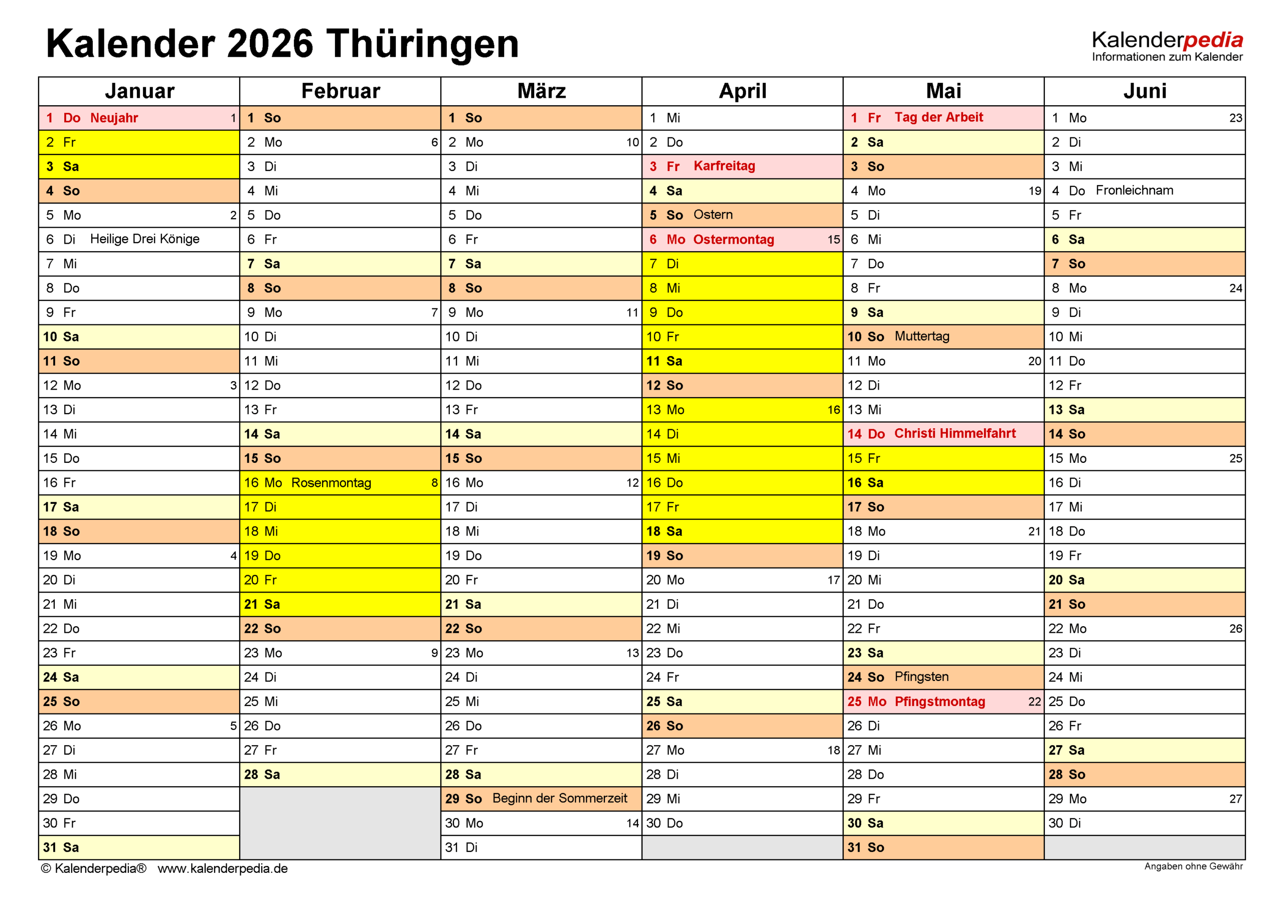 Kalender 2026 Thüringen: Ferien, Feiertage, Excel-Vorlagen.