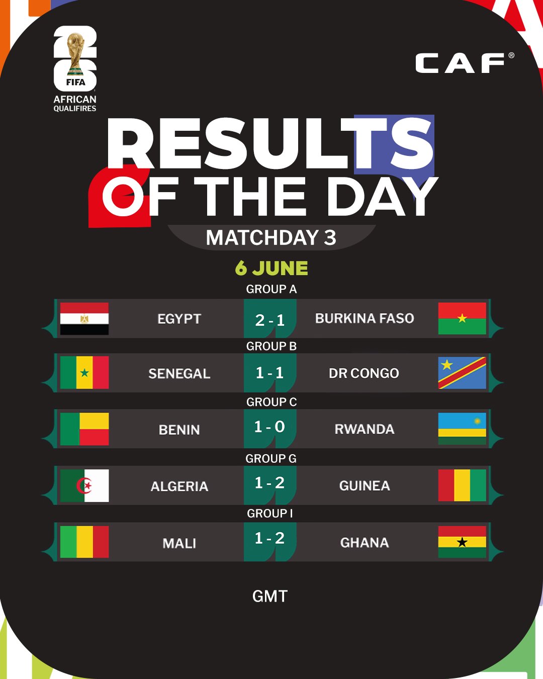 Fixtures and results for Africa’s 2026 World Cup qualifiers.